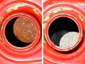 サビ取り処理中にサビ穴からの液もれで周囲を汚す恐れがあります。ポリ容器、バット等でタンクを受けて液の流出を防いで下さい。