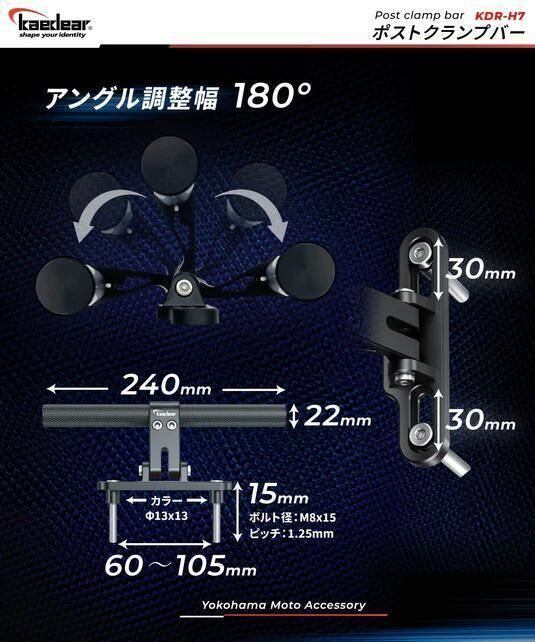・サイズ:クランプバー長さ240mm/径22mm、ボルト穴M8、ボルト幅60~105mm、アングル調整範囲180°