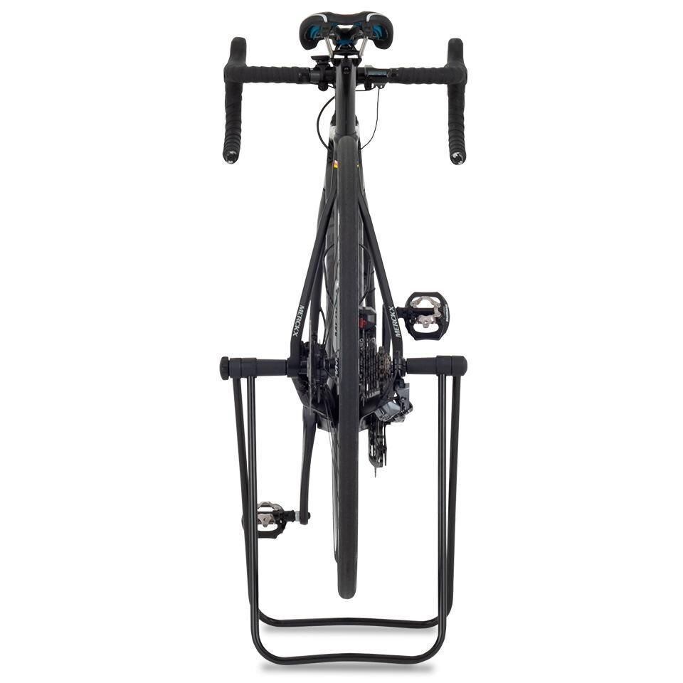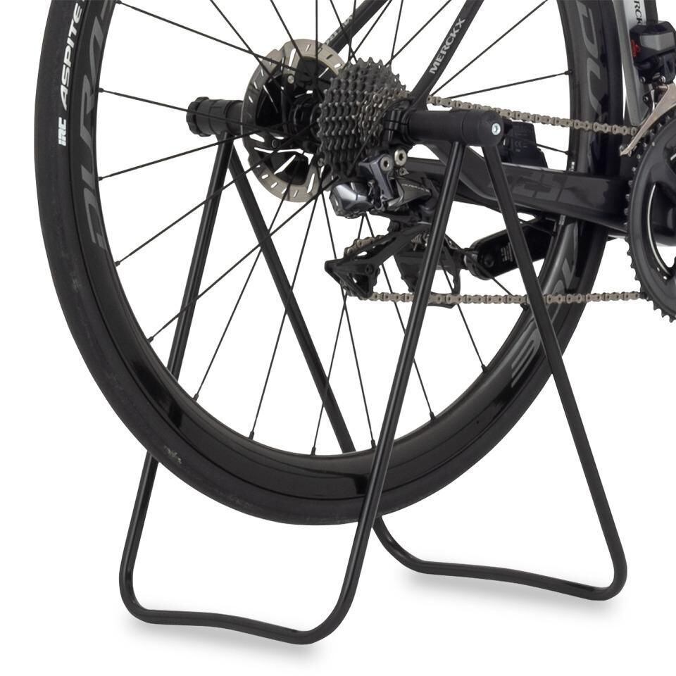 後輪ハブ軸を左右から挟み込み自転車を立たせるシンプルな構造。